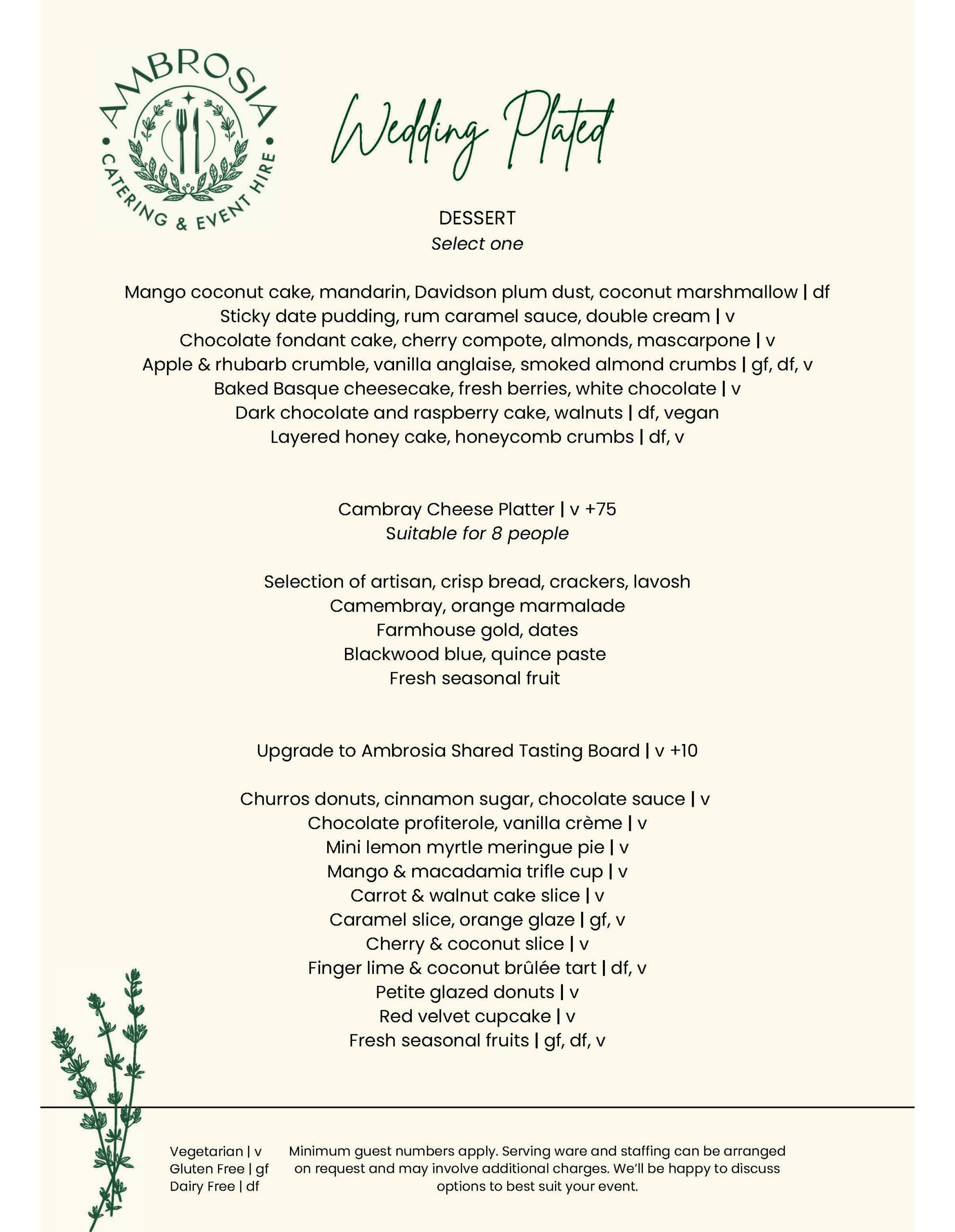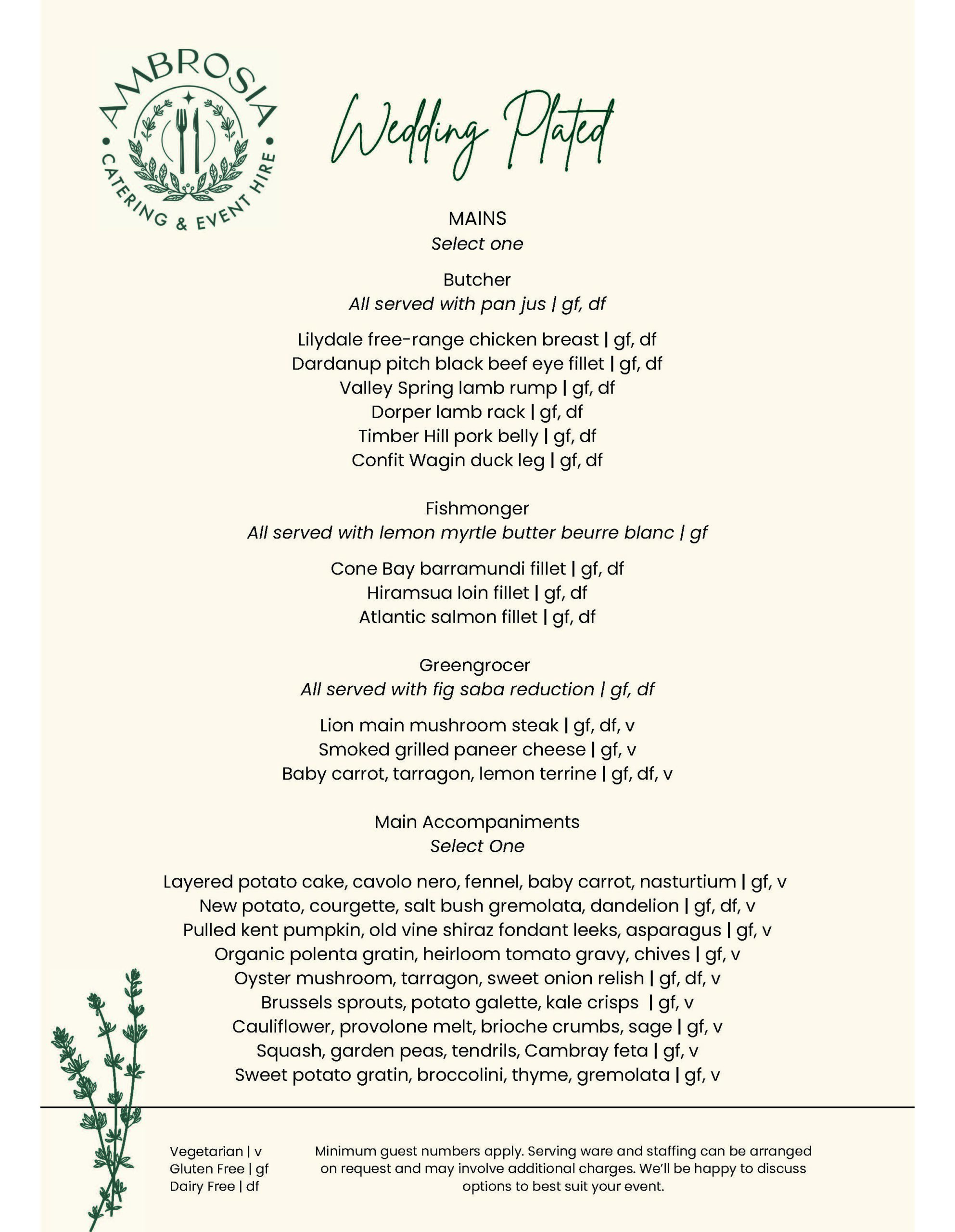 At Ambrosia Catering & Event Hire, we understand that your wedding day is a once in a lifetime occasion, and your dining experience should reflect the elegance and joy of the celebration. Our plated wedding meals are crafted with care, using the finest seasonal ingredients to create a menu that is both beautiful and delicious. From sophisticated entrées to exquisite main courses and indulgent desserts; each dish is expertly prepared and served to your guests with precision. Our plated menu is categorised for ease of selection, you can select from our butcher, fishmonger and greengrocer categories for both entrée and main and the flexibility to choose your main accompaniment to make the perfect dish. Our team is dedicated to ensuring your vision comes to life, offering a personalised touch that makes every bite memorable, we can curate a bespoke menu just for you. Whether you are envisioning a classic menu or something more contemporary, we work closely with you to design a dining experience that perfectly complements your wedding theme and style.